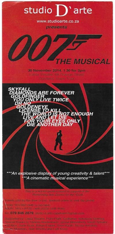 A themed worshops, full of artistic suspense & musical hits from James Bond movies to inlcude 'Skyfall', 'Dimonds are Forever', 'Goldfinger', 'Live and Let Die', 'Die Another Day'.